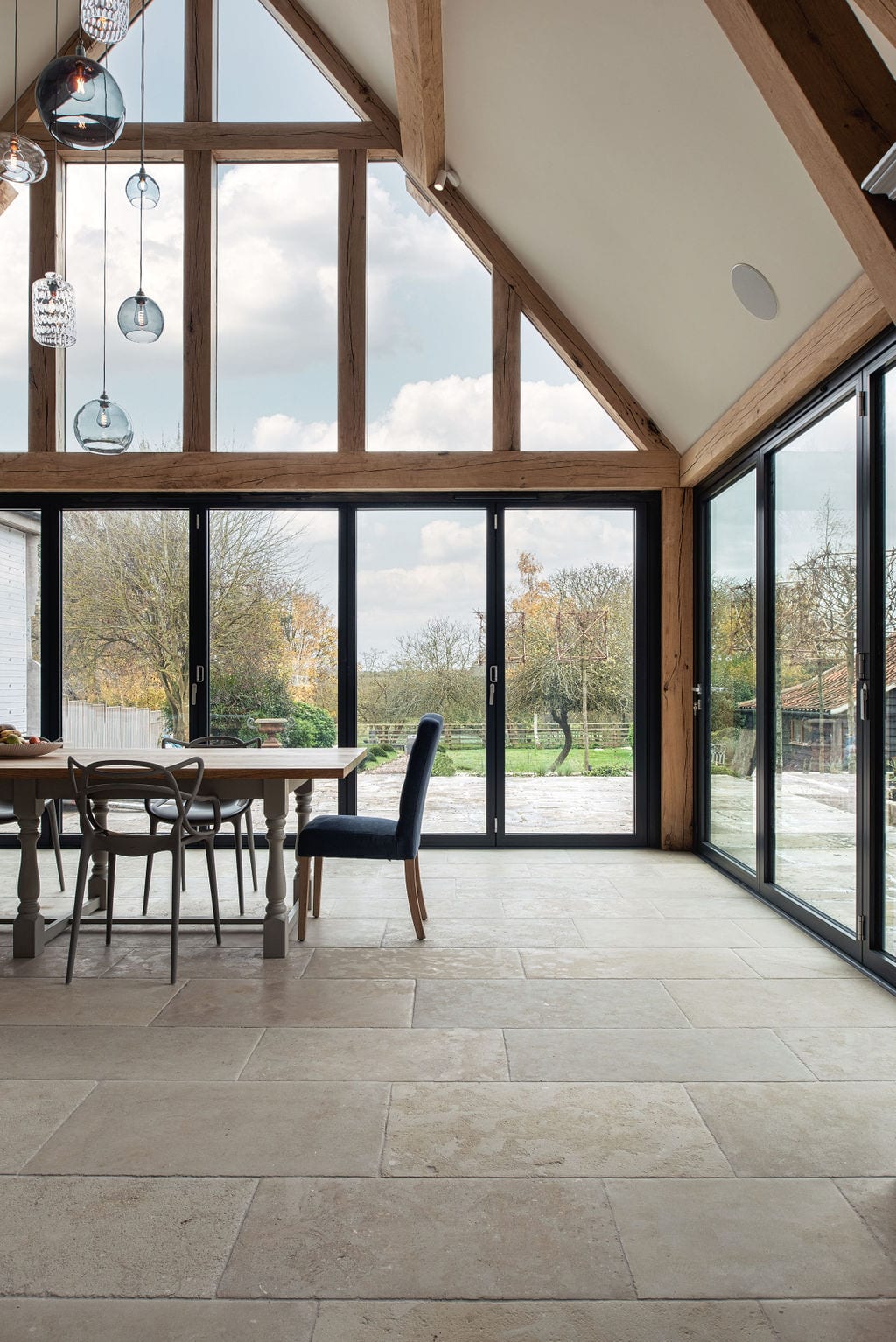 Tiled conservatory roofs ensure this isn't so much of a worry, but if yours features a glass, polycarbonate roof or roof lantern, laminate flooring is equipped to withstand such high levels of sun. The primary stone used for floor tiles is limestone, sandstone, slate, granite, and marble. Marble tiles take a good deal of maintenance and are not great if there are things like spills and can be damaged by acidic liquids. We always recommend a rustic or warm natural stone / stone effect tile for characterful and practical conservatory. This is great if you love the look of real stone, but don't want to spend time sealing your conservatory floor each year.